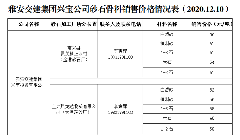 ÑŰ²½»½¨¼¯ˆF(tu¨¢n)ß\(y¨´n)ͨ¹«Ë¾É°Ê¯¹ÇÁÏäNÊÛƒr(ji¨¤)¸ñÇé›r±í£¨2020.12.10£©