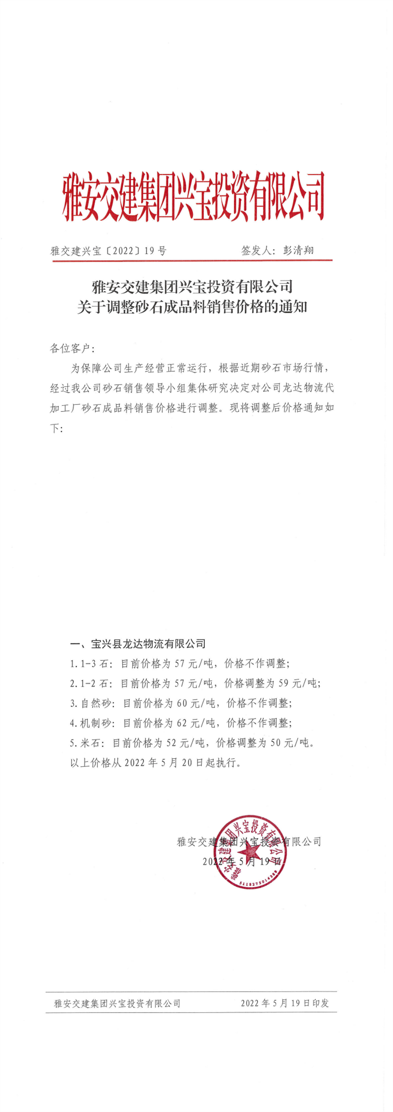 雅安交建集團(tuán)興寶公司關(guān)于調(diào)整砂石成品料銷售價格的通知-2022-5-19
