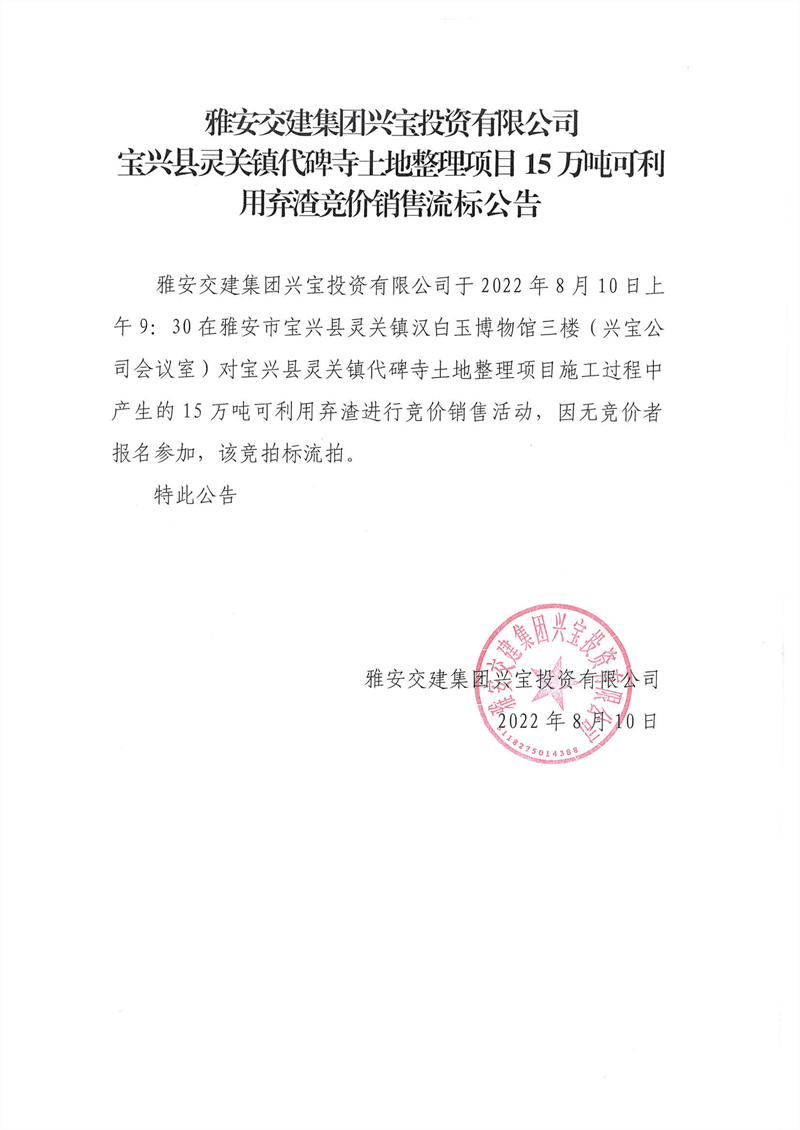 雅安交建集團興寶投資有限公司靈關鎮(zhèn)代碑寺土地整理項目15萬噸可利用棄渣競價銷售流標公告