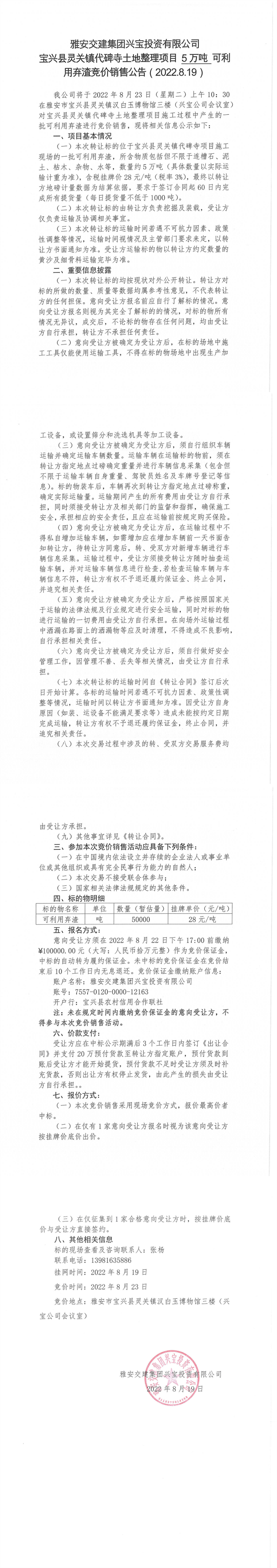 雅安交建集團(tuán)興寶投資有限公司靈關(guān)鎮(zhèn)代碑寺土地整理項(xiàng)目10萬噸可利用棄渣競價銷售公告(2022.8.19)(1)
