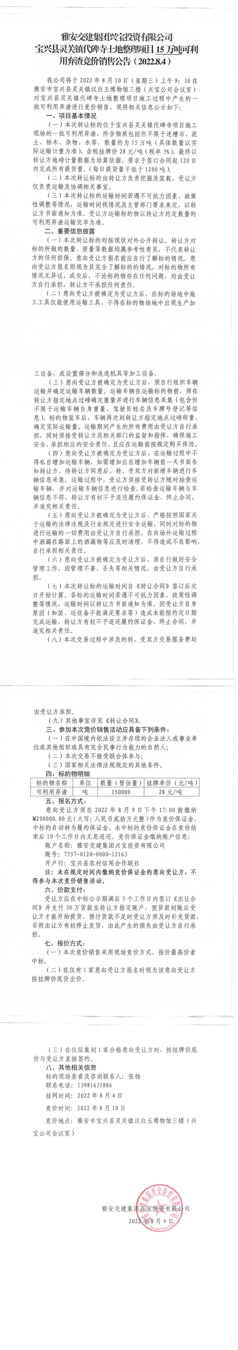 雅安交建集團(tuán)興寶投資有限公司靈關(guān)鎮(zhèn)代碑寺土地整理項(xiàng)目15萬(wàn)噸可利用棄渣競(jìng)價(jià)銷售公告(2022.8.4)