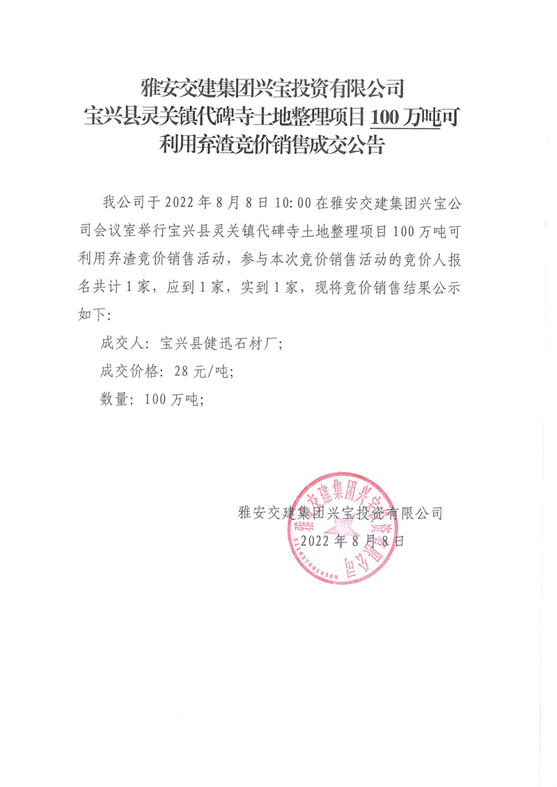 代碑寺土地整理項目100萬噸可利用棄渣競價銷售成交公告