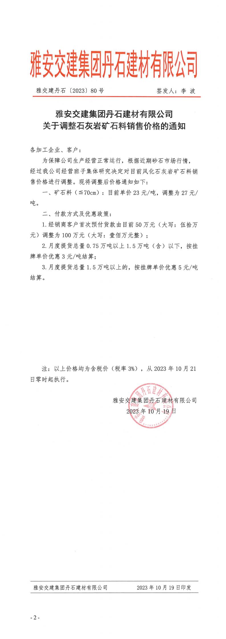 雅安交建丹石公司關(guān)于石灰?guī)r礦石料調(diào)價的通知--2023.10.20