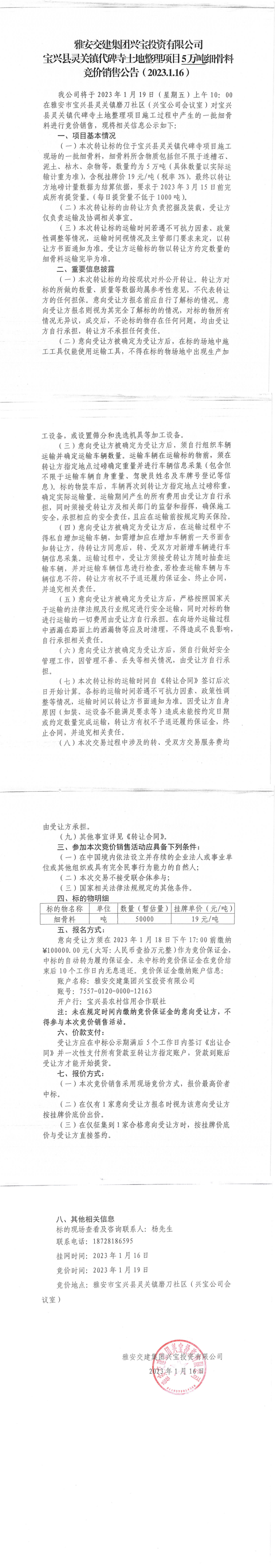 雅安交建集團(tuán)興寶投資有限公司寶興縣靈關(guān)鎮(zhèn)代碑寺土地整理項(xiàng)目5萬(wàn)噸細(xì)骨料競(jìng)價(jià)銷(xiāo)售公告(2023.01.16)