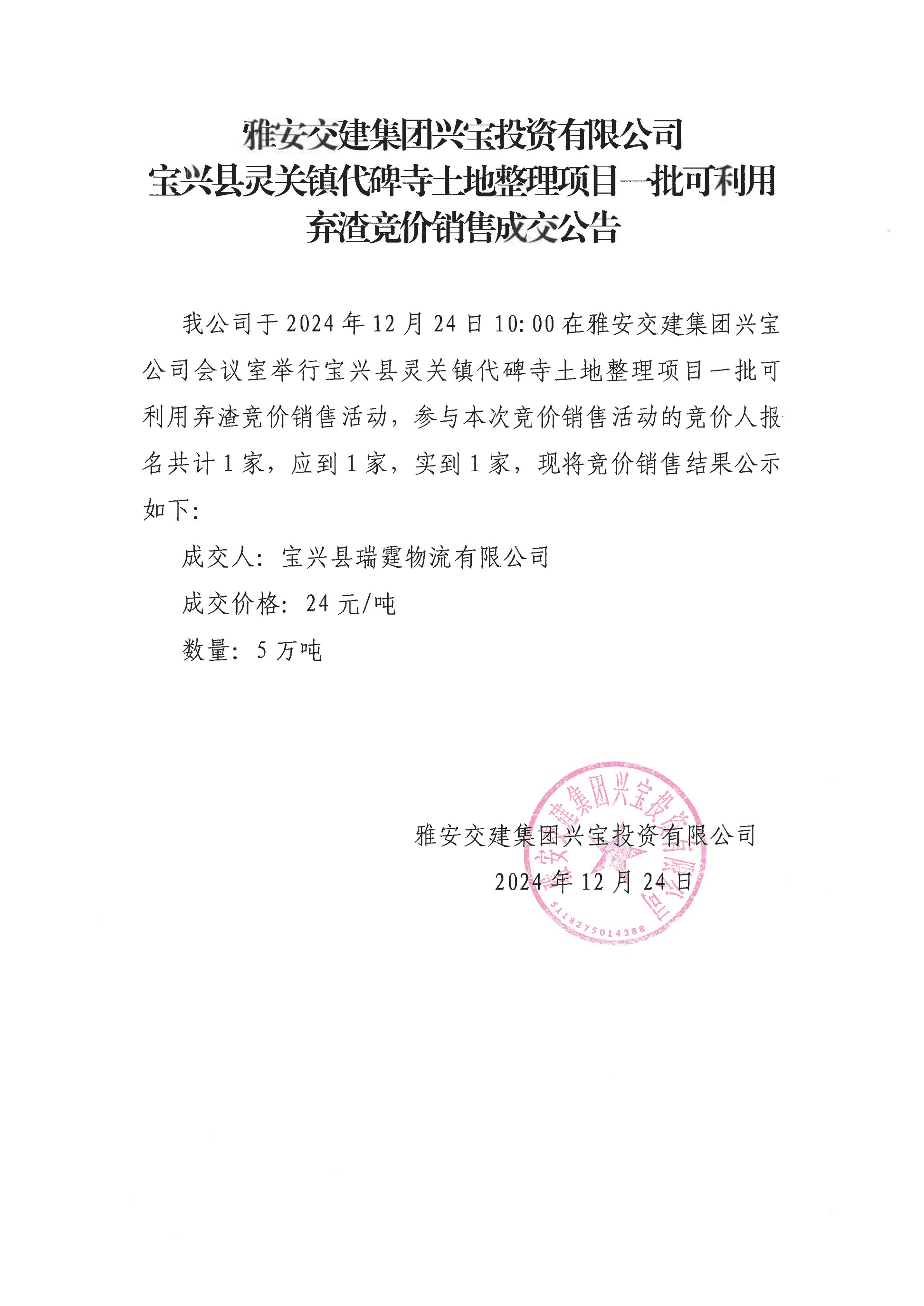 雅安交建集團(tuán)興寶投資有限公司靈關(guān)鎮(zhèn)代碑寺土地整理項目5萬噸可利用棄渣成交公告(2024.12.24)