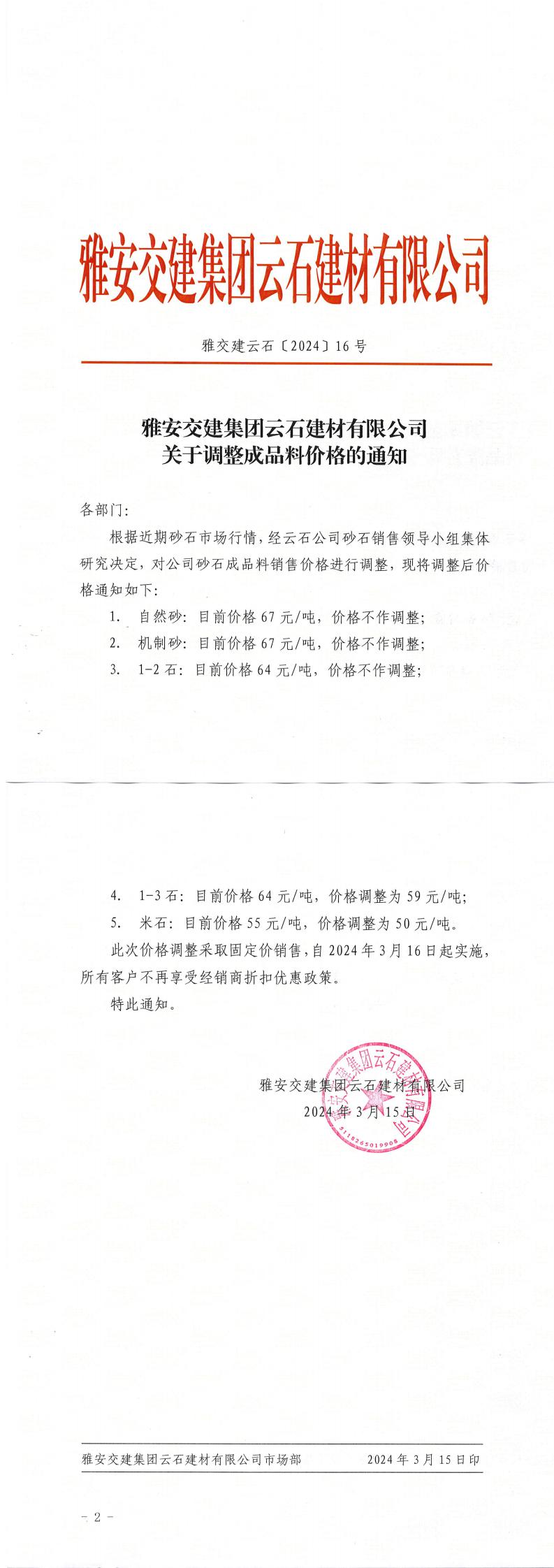 雅安交建集團云石建材有限公司成品料價格調(diào)整公告(2024-2-21)