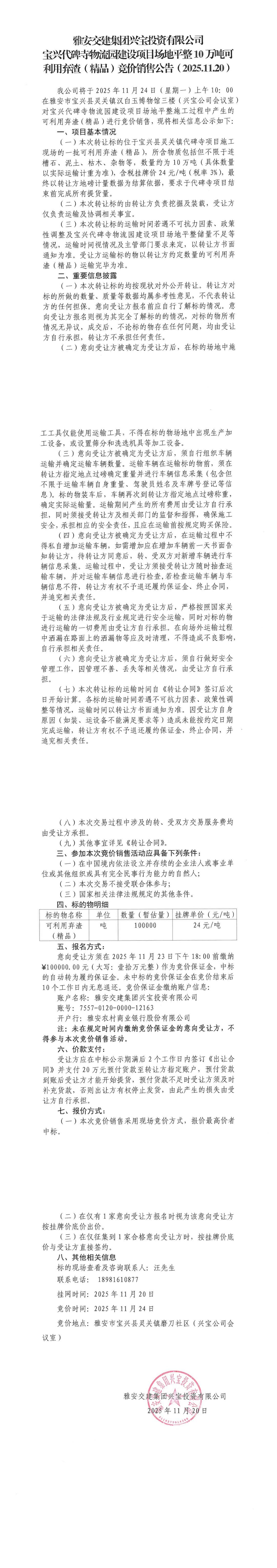 雅安交建集團(tuán)興寶投資有限公司寶興代碑寺物流園建設(shè)項目場地平整10萬噸可利用棄渣(精品)競價銷售公告(2025.11.20)